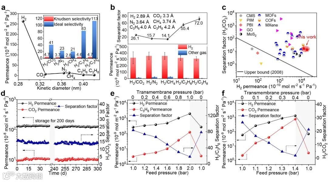 实验结果表明,由自下而上的g-C3N4纳米片组装的g-C3N4膜具有显著的分离性能,其中H2对CO2、N2、CH4、C3H6和C3H8的选择性分别为41、23、21、83和113,远远超过了努森选择性。此外,g-C3N4膜在温度波动、潮湿环境和超过200天的长期运行时也显示出良好的稳定性,在气体分离应用中具有很大的前景。