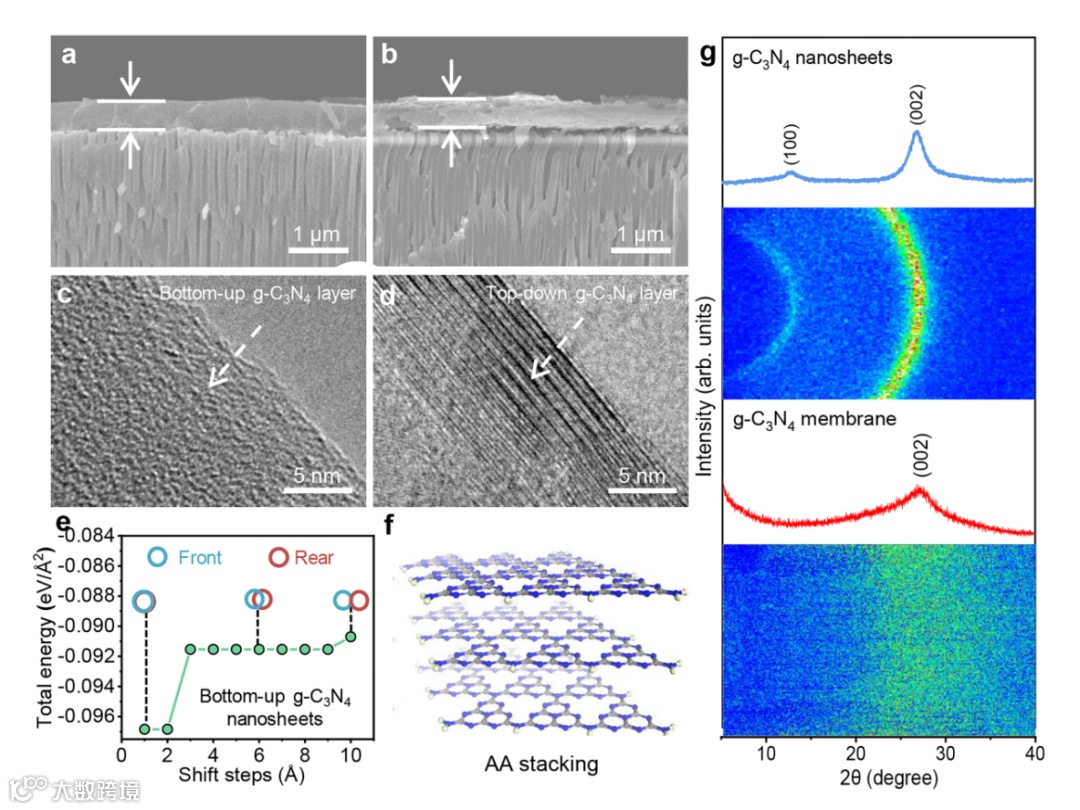 为了避免g-C3N4纳米片的重堆积,异丙醇被作为客体分子来削弱g-C3N4纳米片之间的π-π相互作用,最终制备了具有无序堆积结构的层状g-C3N4膜。DFT计算表明自下而上g-C3N4纳米片倾向于AA堆叠形成g-C3N4膜。