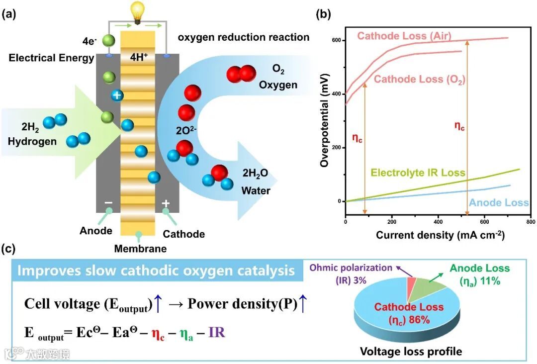 图1.(a)PEMFC反应示意图;(b, c)影响PEMFC电压和阳极、阴极、欧姆极化损耗的分布图