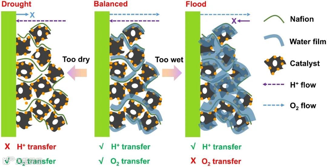 与Pt基催化剂类似,将无Pt催化剂的活性和稳定性最大限度的转移到PEMFC中同样面临着很大挑战。由于缺乏足够的认识和知识来知道燃料电池膜电极的设计合成,因此目前ORR过程中反应气体,质量和电荷传输的最佳三相界面还有待进一步探究。越来越多的实验结果表明,在饱和气体的三电极体系下ORR活性的趋势与PEMFC中由很大的不同。传统催化剂的制备过程中将催化剂,Nafion溶液以及分散液超声混合均匀后喷涂在质子交换膜上,这种含有离聚物的复杂电极限制了气体和质子的传输以及水的及时排除。一般来说,电极内微孔中活性位点的可及性有限,使得催化剂的利用率大大降低,因此膜电极结构在动力学和质量传输方面起着至关重要的作用。尽管无Pt催化剂的性能得到了令人鼓舞的提高,但在MEA中仍然存在催化剂利用率(低质量活性)、较差的质子和电子传输以及严重的水淹现象。离聚物在催化剂颗粒中的分散较差往往导致传输效率较低,这可能与催化剂的孔隙结构有关,微孔和介孔能够明显提高催化剂的利用率,大孔增加反应物的传质效率。因此,建立高效的离聚物/催化剂分级多孔界面对于阴极PEMFC的三相边界至关重要。
