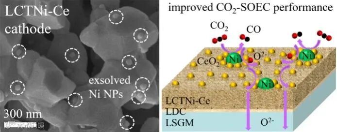 图1. LCTNi-Ce阴极表面形貌和电解池阴极侧发生CO2电解反应的示意图。