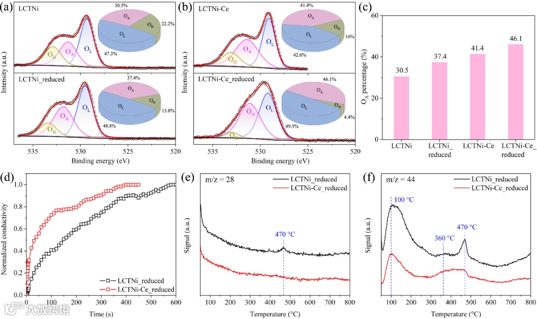 图5. LCTNi和LCTNi-Ce还原粉末样的表征:(a, b) O 1s XPS,(c)表面氧物种占比,(d) ECR曲线和CO-TPD的(e) CO (m/z= 28)和(f) CO2 (m/z= 44)结果。