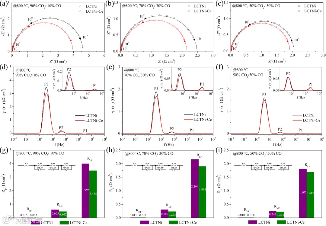 图3. LCTNi和LCTNi-Ce半电池在CO2/CO气氛中800 °C下的EIS数据:(a, b, c) Nyquist图,(d, e, f) DRT分析和(g, h, i)拟合的极化阻抗值。