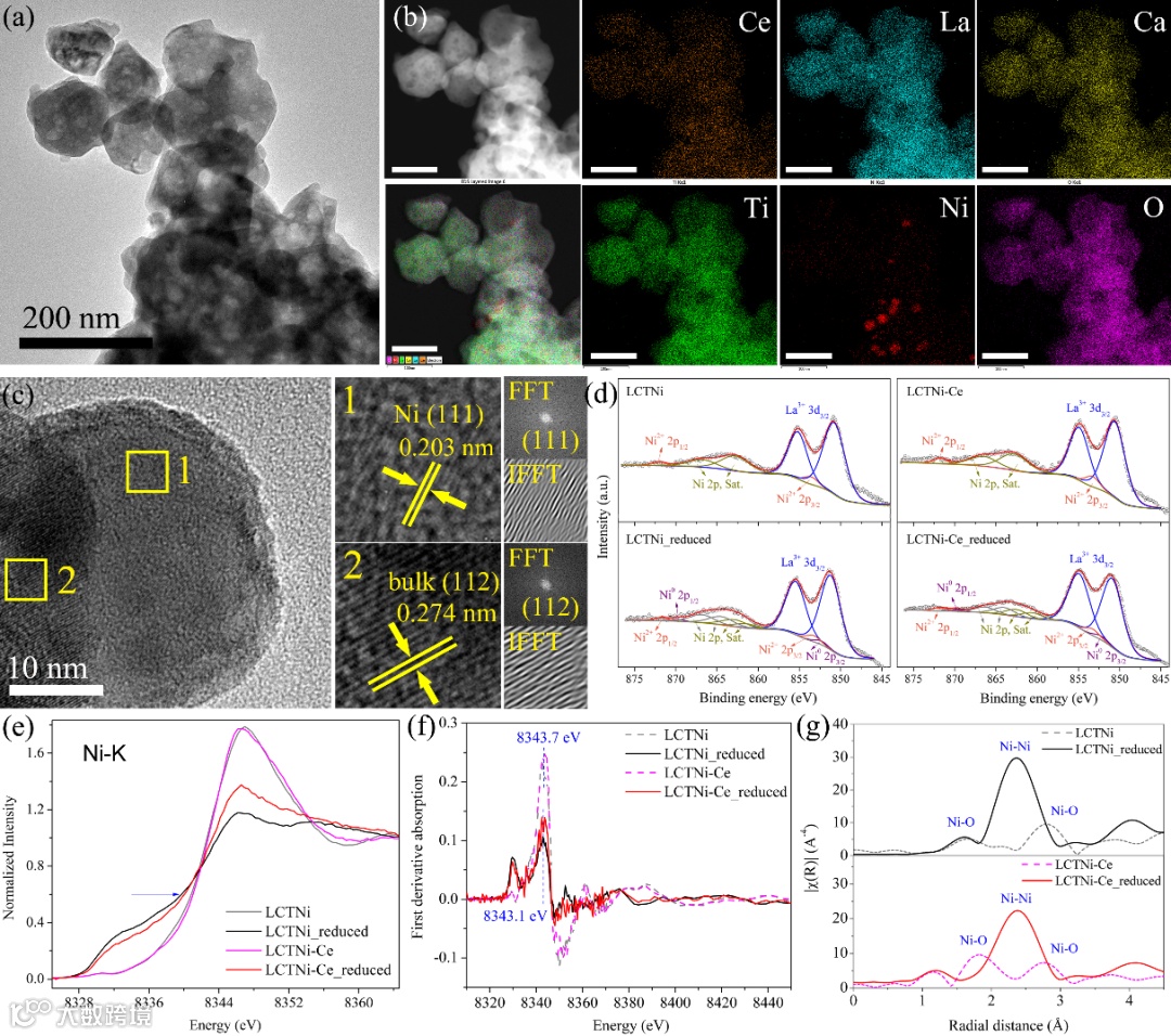 图2. LCTNi-Ce阴极表面原位析出的Ni纳米颗粒表征:(a) TEM, (b) EDS-mapping, (c) HRTEM, (d) Ni 2p XPS,(e) Ni的K边XANES谱,(f)一阶导数和(g) Ni的K边EXAFS谱的傅里叶变换拟合结果。