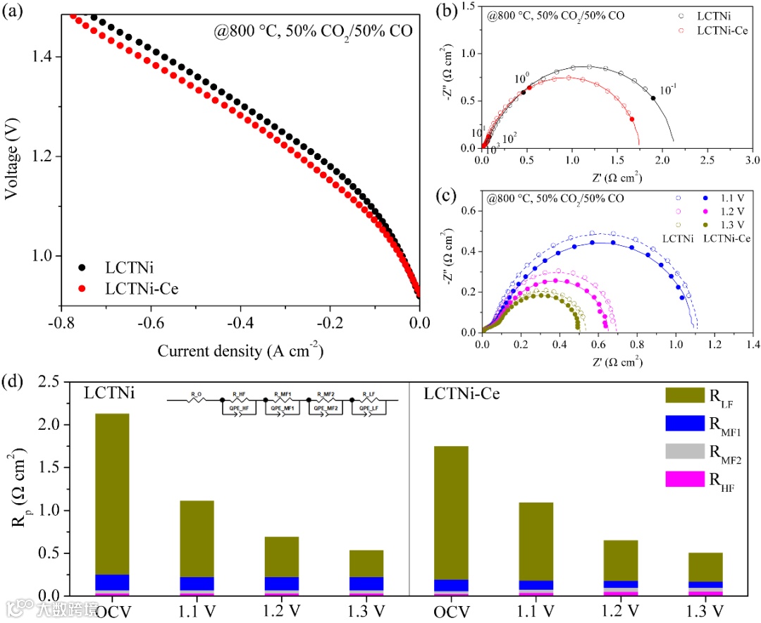 图4. LCTNi和LCTNi-Ce电解池在50% CO2/50% CO中800 °C下的电化学性能:(a) j-V曲线,(b) OCV和(c)不同电解电压下的EIS结果,及(d)拟合的极化阻抗值。