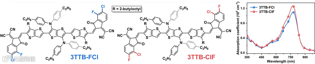 本工作提出端基转置策略,即对卤原子的取代位置进行互换,设计并合成了两个新型非稠环电子受体3TTB-FCl和3TTB-ClF(图1-2)。紫外-可见吸收光谱显示3TTB-ClF在固态下的吸光系数(1.27 × 105 cm−1)明显高于3TTB-FCl(1.10 × 105 cm−1),表明其分子间存在更强的相互作用和更紧密的堆积。