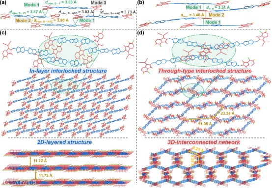单晶XRD衍射分析结果表明,3TTB-FCl存在多重分子内非共价相互作用介导的层内互锁结构,从而形成二维层状聚集态结构。相反,3TTB-ClF由分子间π-π相互作用构成了一个贯通式互锁结构,因此形成三维互穿网络的聚集态结构,构筑电荷传输高速通道。