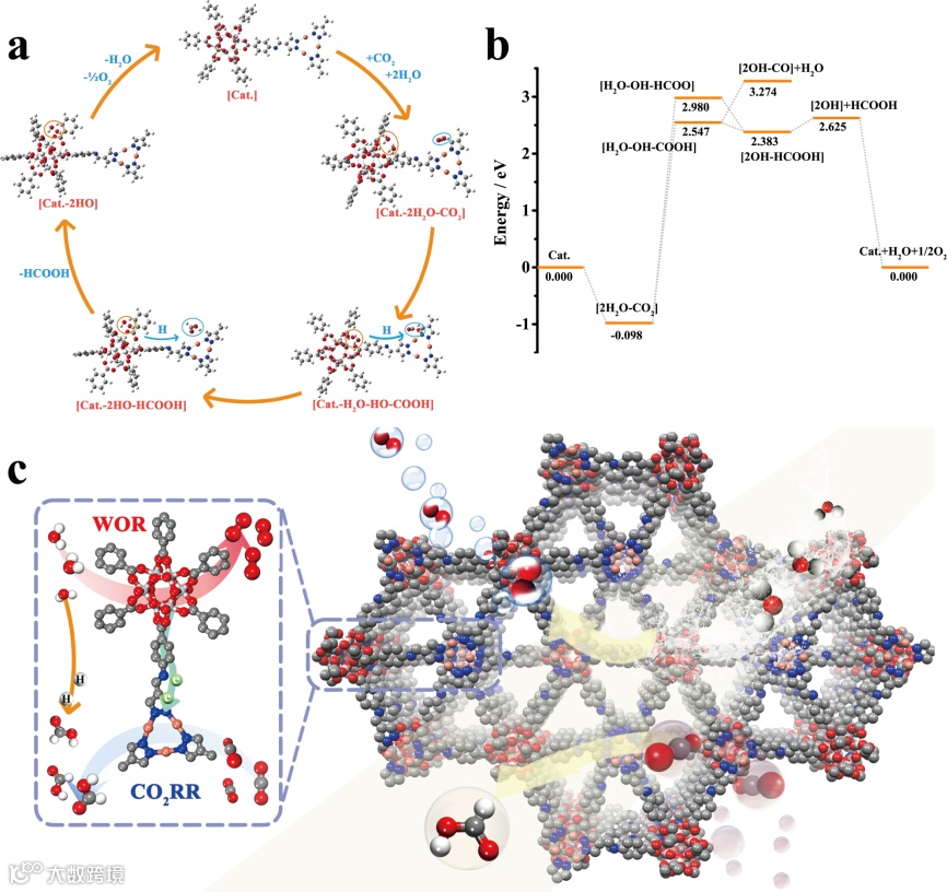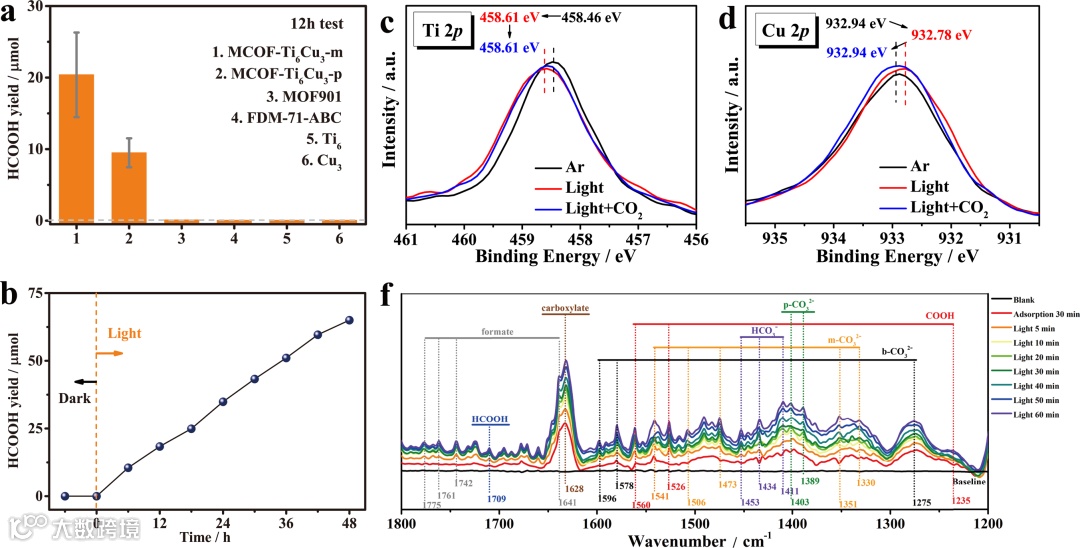 该催化剂具有空间分离和功能协作的的作用,可以剥离成超薄二维纳米片,暴露大量活性位点,在仅有水和模拟太阳光条件下表现出优越的光催化活性,高效生产HCOOH。作者利用XPS和原位XPS测试证实了异金属团簇结构MCOF-Ti6Cu3中的电子转移,在光激发的条件下电子流向Cu,能够在Cu簇发生还原反应,Ti簇上发生氧化反应,并进一步通过原位红外和DFT计算解释了中间体和反应机制。