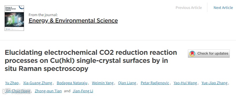 基于此,来自厦门大学的李剑锋教授与董金超副教授在国际知名期刊Energy & Environmental Science上发表题为“Elucidating electrochemical CO2 reduction reaction processes on Cu(hkl) single-crystal surfaces by in situ Raman spectroscopy”的文章。