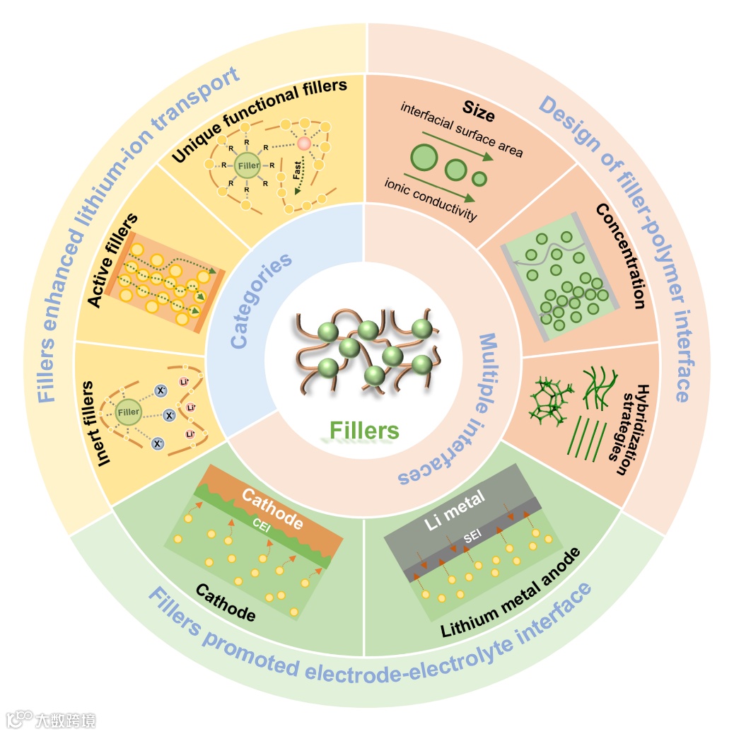 图1. 复合聚合物电解质中填料的分类、离子传输机理与影响因素,以及界面设计原理总结。