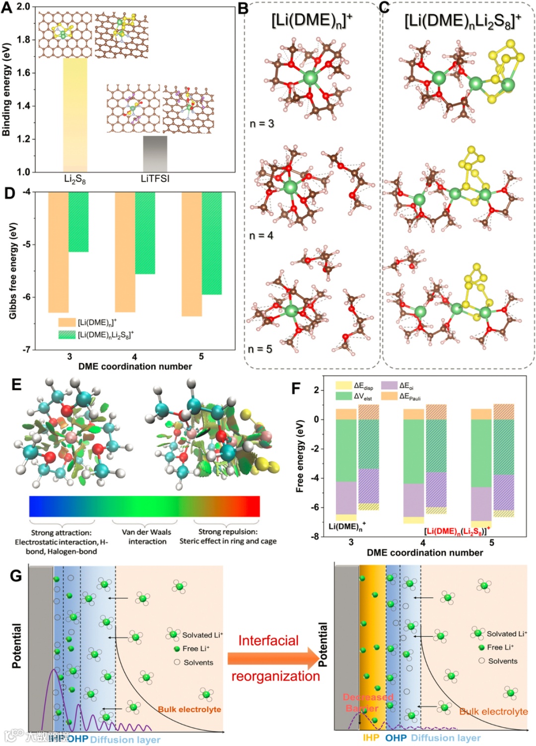 计算结果表明,将Li2S8加入[Li(DME)3]+体系中,[Li(Li2S8)(DME)n]+中Li+的溶剂化自由能略有增加,这是由于Li2S8中的Li原子在Li2S8和DME之间形成Li-O来破坏初始溶剂化壳,所以影响溶剂化壳层结构的主要是Li2S8分子中的Li+。Li2S8的引入,将Li+ 从[Li(Li2S8)(DME)n]+体系中解离的能量降低了约 20-27 kJ mol-1,这证明了Li2S8在重组内溶剂化壳以实现快速 Li+ 去溶剂化方面的优势。DFT计算的结论是Li2S8分子调节了Li+溶剂化壳层结构,从而降低了其去溶剂化能,将原来的[Li(DME)3]+溶剂化壳层结构改变为[Li(Li2S8)(DME)n]+,而且多硫化物层在内亥姆霍兹平面层中占主导地位,降低了Li+跨界面传输势垒。