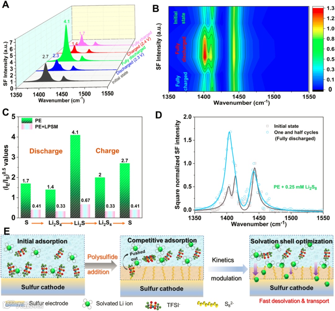 在PE电解液中,(IE/IS)0.5的初始值在开路状态下约为2.7,充放电过程中,(IE/IS)0.5的变化趋势发生逆转,但并不会完全恢复到其初始值(1.7 与 2.7),但是对于LPSM(Li2S8),(IE/IS)0.5值经历了类似的先减小后增大的趋势,可以完全恢复到其初始值,意味着动态电化学过程中TFSI-物质的量可逆以及最佳Li+溶剂化壳结构的可逆重组,证明了多硫化物辅助溶剂化壳在各种状态下的可逆性。LPSM 存在时,TFSI-的界面吸附量显着降低,在第一第二次循环均如此,表明重组溶剂化壳结构用于快速锂离子传输的可行性。LPSM的作用机理如下:1)多硫化物(Li2S8)分子在界面处与LiTFSI激烈竞争,重组溶剂化壳结构并在正极表面形成亲硫介体层; 2)利用多硫化物内亥姆霍兹层,实现了Li+的快速去溶剂化,以加快S或Li2S的插入/脱出,降低了Li+传输的界面势垒,并形成了电位缓冲层。