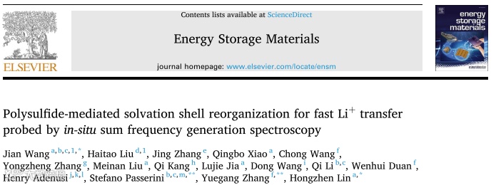 Polysulfide-Mediated Solvation Shell Reorganization for Fast Li+ Transfer probed by in-situ Sum Frequency Generation Spectroscopy Energy Storage Mater. 2024, 67, 103289