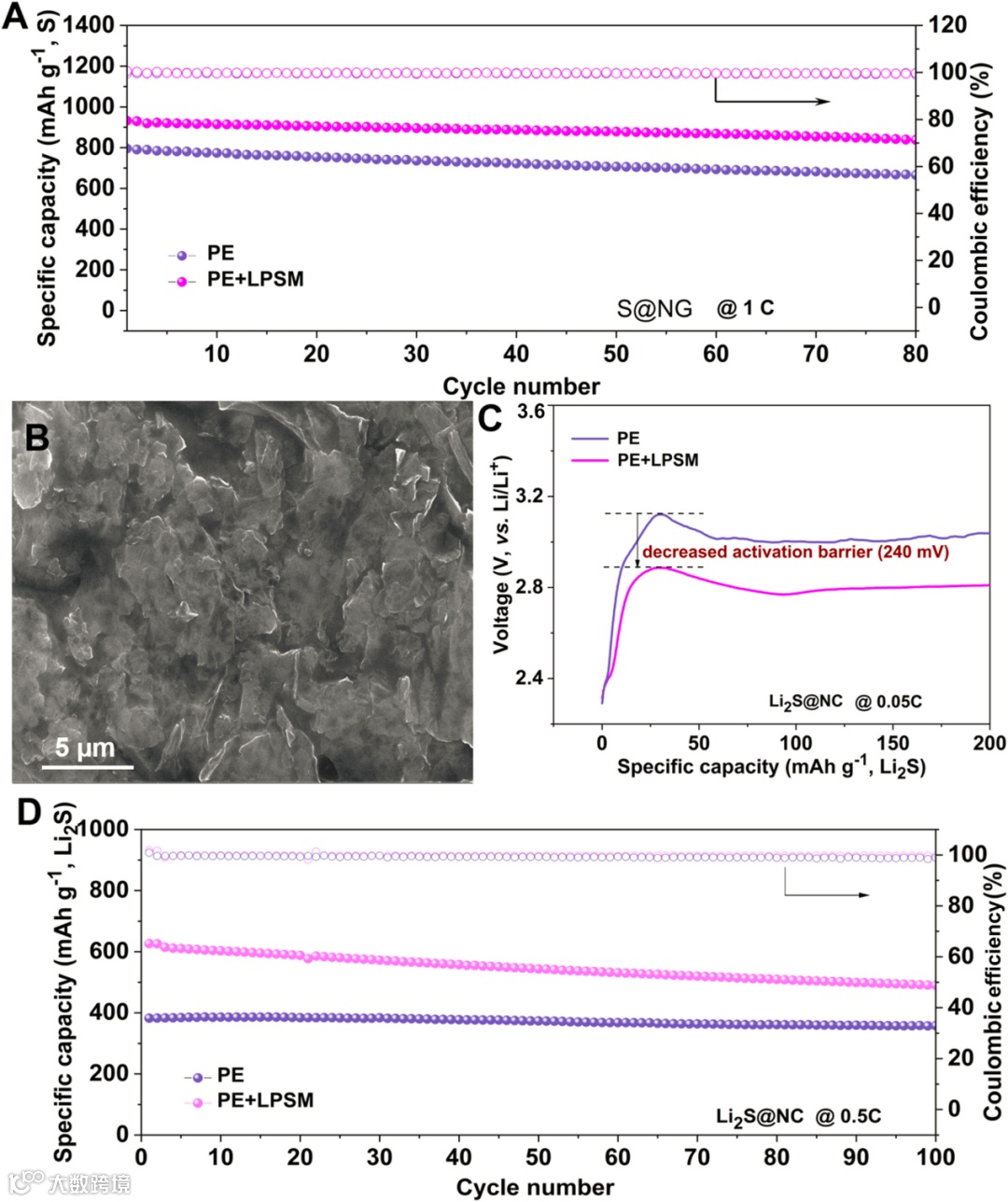 对Li-S电池的电化学性能进行了比较,具有最佳溶剂化壳的电池比没有Li2S8的电池表现出更高的初始容量和循环稳定性。对循环后的正极进行扫描电子显微镜 (SEM) 图像,表现出光滑的表面和硫的均匀分布,在完全充电/放电状态下没有任何硫或 Li2S 聚集,这验证了多硫化物可以调节界面 Li+ 传输和加速溶剂化壳重组。通过重组的溶剂化壳,Li2S的脱锂势垒可以从3.12 V显着降低至2.88 V,多硫化物改变了溶剂化壳结构,缓冲了Li+从Li2S到电解质的剧烈化学环境的变化,并减少了由吸附引起的额外界面能垒。