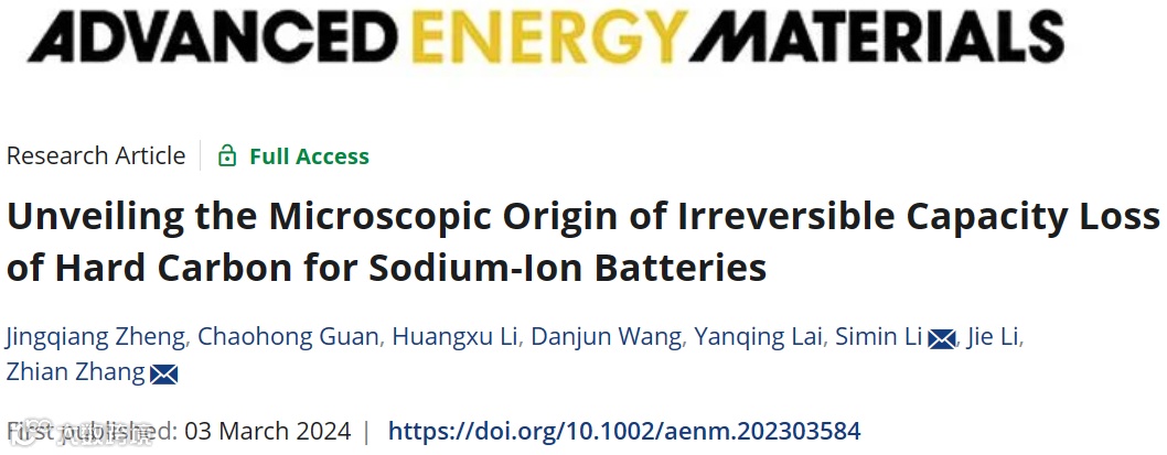 近日,来自中南大学的张治安教授与李思敏讲师,在国际知名期刊Advanced Energy Materials上发表题为“Unveiling the Microscopic Origin of Irreversible Capacity Loss of Hard Carbon for Sodium-Ion Batteries”的研究文章。该研究文章针对微观层面上硬炭容量损失的原因尚不清楚,严重制约了硬炭负极的改进的问题。研究了影响硬炭结构和组成的两个关键阶段,即合成和储存阶段。确定了造成不可逆容量损失的关键决定因素。