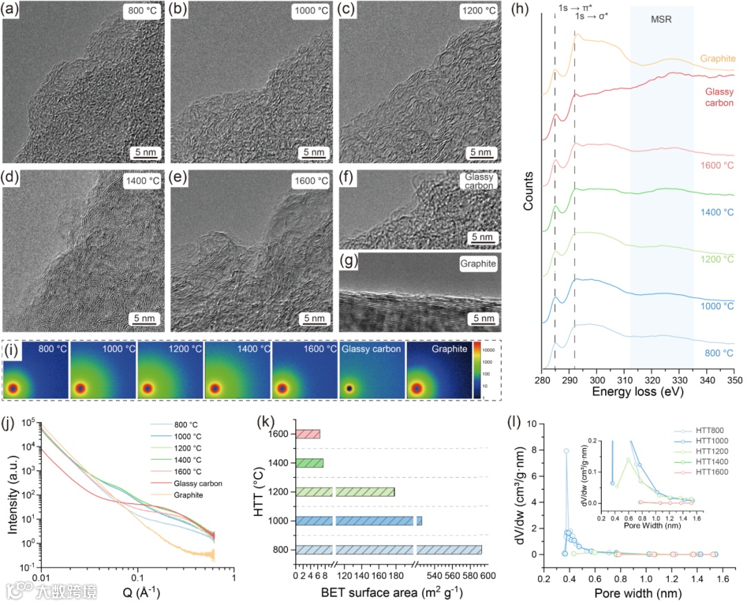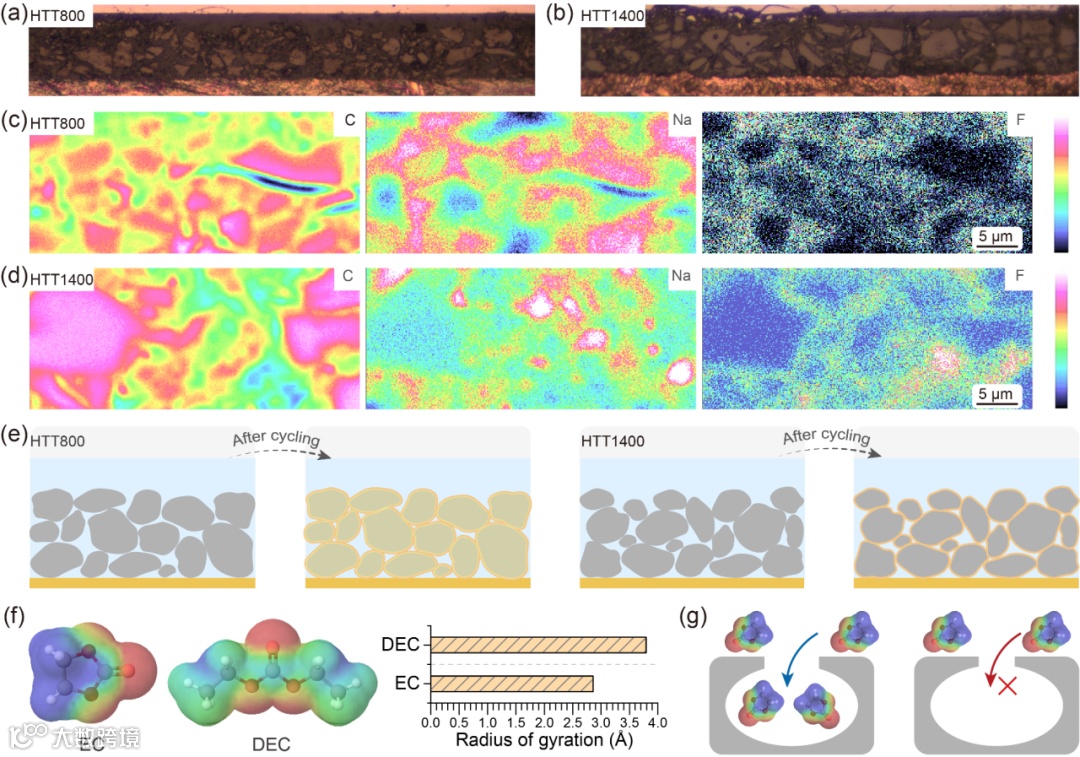 基于对不同温度下硬炭结构的解析,作者得出溶剂分子可以进入生长不完全硬炭的碳层内部,从而造成不可逆的容量损失。因此,对这些开孔给予最大的关注是至关重要的,因为当溶剂分子的直径小于开孔的直径时,溶剂分子将渗透到材料的体相中。这使得材料的实际比表面积,也就是“电解液可及的表面积”远远大于材料的外表面积,从而导致过多的不可逆容量损失。