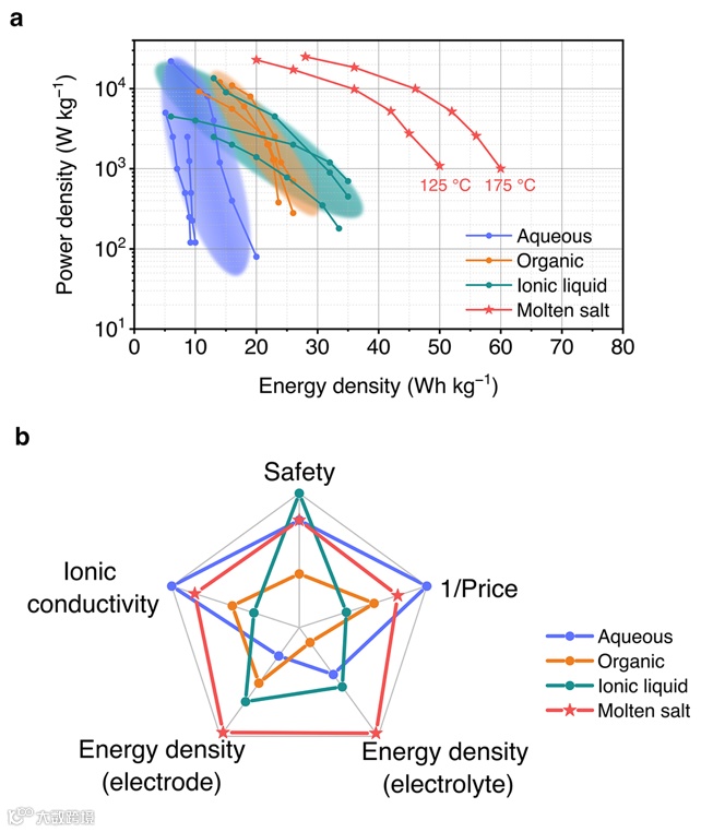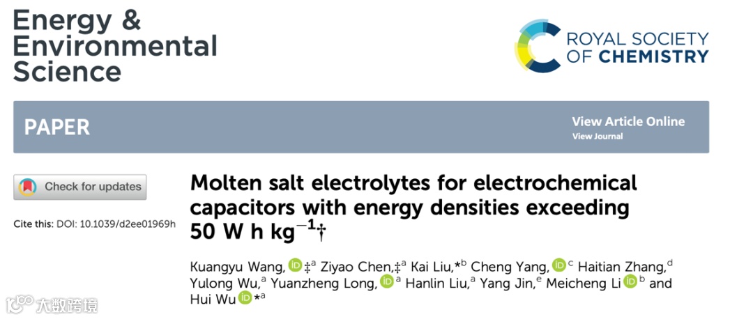 基于此,来自清华大学的伍晖教授与华北电力大学的刘凯教授合作,在国际知名期刊Energy & Environmental Science上发表题为“Molten salt electrolytes for electrochemical capacitors with energy densities exceeding 50 W h kg-1”的研究论文。