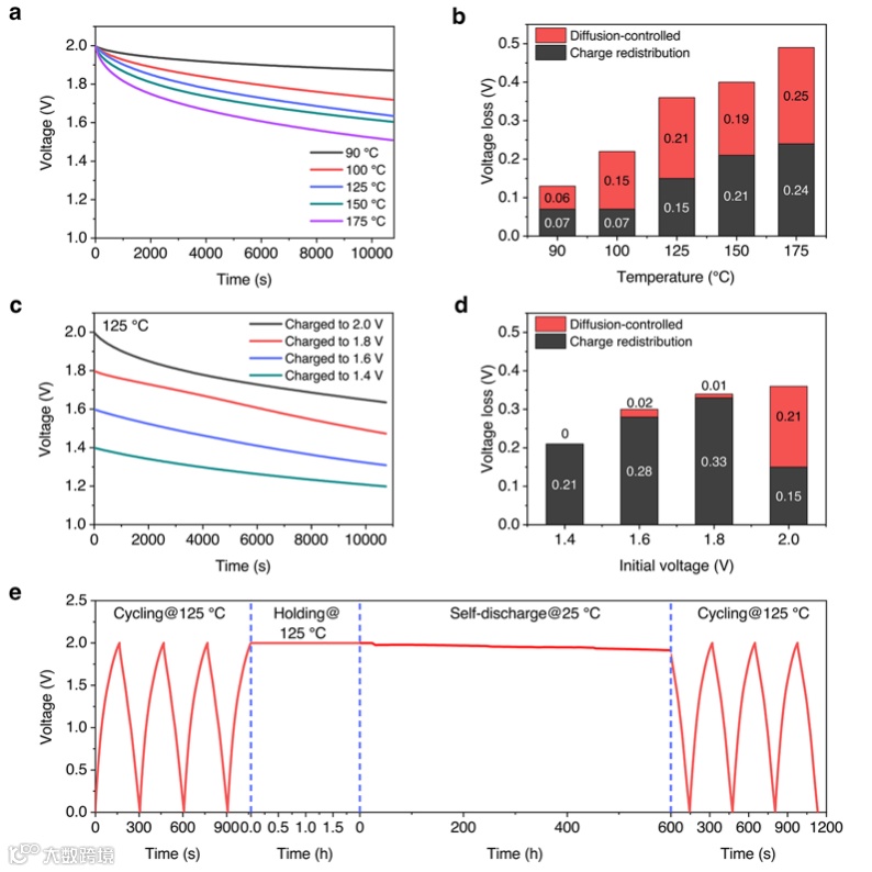 电化学电容器往往存在较为严重的自放电问题,使得储能效率下降。因此,许多研究致力于通过电解液添加剂和隔膜材料的设计降低电化学电容器的自放电速率。然而,这些方法可能会导致材料成本的增加和电解质离子电导的降低。该文章创新性地利用无机熔盐电解质的相变特征调控了器件的自放电速率,实现了近一个月的长时间储能。基于无机熔盐的电化学电容器的自放电速率与工作温度具有很强的关联性。