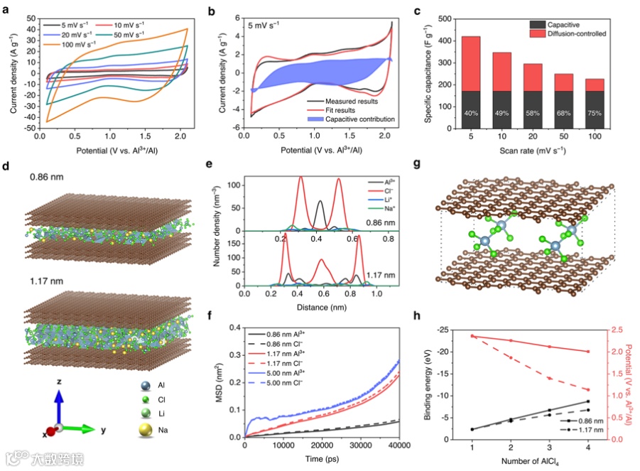 在AlCl3–NaCl–LiCl无机熔盐电解质中,活性炭电极的储能过程遵循物理吸附-化学吸附复合机制,这源于限域在电极的纳米孔中的熔盐电解质的独特结构和特性。一方面,在特定的纳米限域条件下,熔盐电解质中离子排布会发生改变,并有助于形成更致密的双电层结构,进而使电极比电容升高。另一方面,DFT模拟表明,无机熔盐中存在的AlCl4-会与电极发生嵌入反应。因此,活性炭电极在熔盐中表现出了相当大的扩散控制电容。