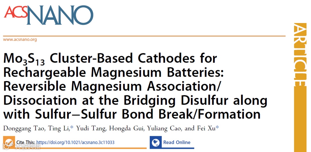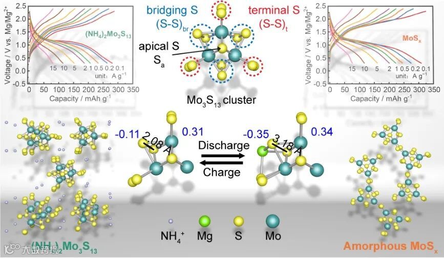 近日,武汉大学徐飞与中南民族大学李婷课题组在美国化学会期刊ACS Nano上发表题为“Mo3S13 Cluster-Based Cathodes for Rechargeable Magnesium Batteries: Reversible Magnesium Association/Dissociation at the Bridging Disulfur along with Sulfur–Sulfur Bond Break/Formation”的研究文章。针对镁离子电荷密度大的问题,本工作设计了电荷离域的Mo3S13团簇材料(结晶(NH4)2Mo3S13和非晶MoSx)作为可充电镁电池的正极,利用Mo‒S类共价键促进负电荷离域和双元素氧化还原。这两种正极都显示出高储镁容量(在100 mA g–1电流密度下分别为296和302 mAh g–1)和优异的倍率性能(在15 A g–1电流密度下分别为76和80 mAh g–1)。机理研究表明,作为镁离子的缔合位点,Mo3S13团簇的桥联硫(S‒S)br的价态在充放电过程中可逆变化且S‒S键断键/成键,使得镁离子的缔合/解缔高度可逆。本研究说明了在镁电池正极材料的设计中构建有利的储镁活性位点的重要性。