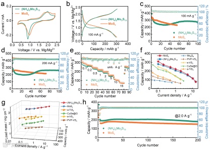图3. (NH4)2Mo3S13和非晶MoSx的储镁性能。
