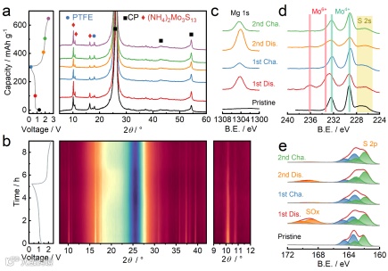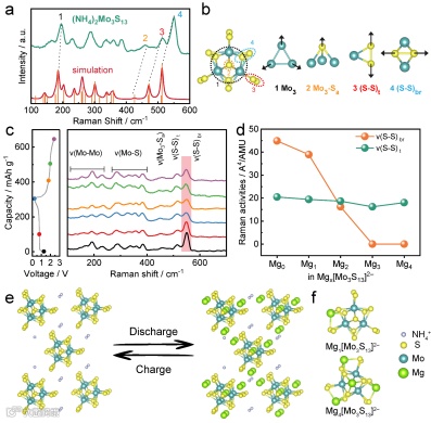 采用非原位XRD、原位XRD、XPS、FT-IR、拉曼和理论计算等手段研究了(NH4)2Mo3S13的储镁反应机理。结果表明,(NH4)2Mo3S13的储镁活性位点是Mo3S13团簇的桥联二硫基团(S–S)br。在放电过程中,桥联硫(S–S)br的S–S键断裂,Sbr价态降低,镁离子与Sbr缔合。在充电过程中,Sbr价态升高,S–S重新成键,镁离子解缔。作为镁离子的缔合位点,桥联硫Sbr的价态在充放电过程中可逆变化(放电时降低,充电时升高),使得镁离子的缔合/解缔高度可逆,故而获得了优异的倍率性能。由于Mo–S的类共价键特性,充放电过程中Mo和S的价态均发生变化,因此获得了较高的可逆容量。