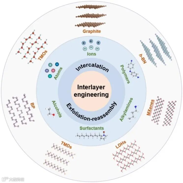 图1. 应用于不同层状材料的层间工程策略示意图。