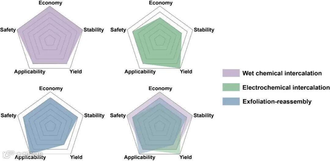 层状材料的层间工程策略包括插层与剥离-重组装。插层是一种常见的方法,通过将外部客体物质嵌入层状材料的层间空间,可以实现对材料物理/化学性质的精细调控。根据插层方式,插层可以分为湿化学插层与电化学插层。湿化学插层法简单、安全且适合规模化制备,但该方法在插层剂浓度的精确调节和化学均匀性方面存在局限性。电化学插层法可以通过控制施加的电压来精确控制插层过程,这弥补了湿化学插层的不足。剥离-重组装方法适用于一些无法直接插层的层状材料。通过将层状材料剥离成二维材料,再进一步组装,可以实现构建一系列功能材料,例如纳米复合材料和纳米膜。