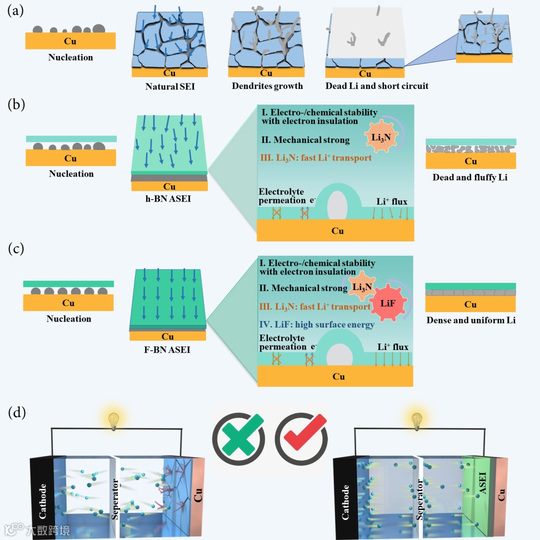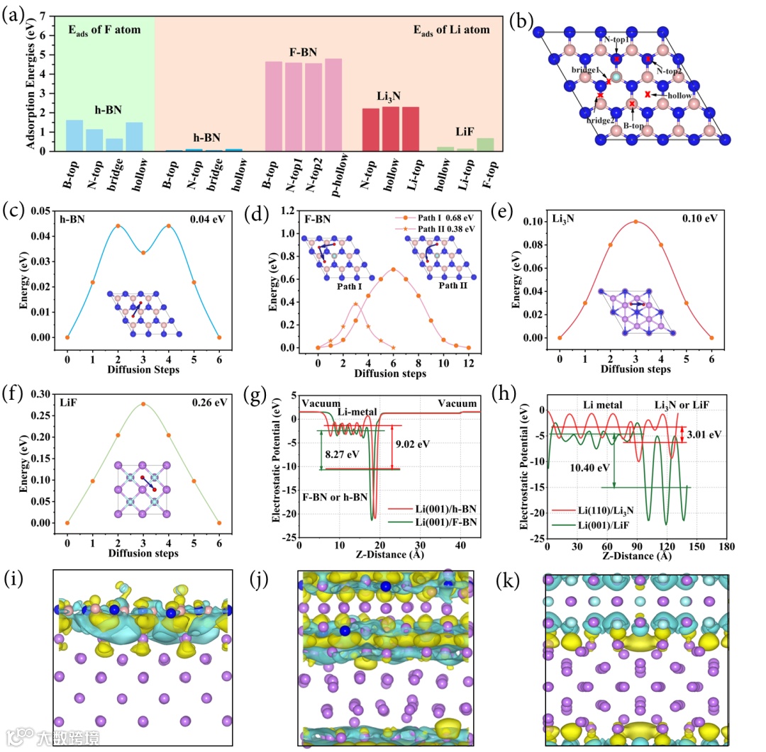 基于此,电子科技大学李白海教授课题组在国际期刊Nano Res.上发表题为“Synergy of in-situ heterogeneous interphases tailored lithium deposition”的研究工作。该工作通过引入氟化氮化硼(F-BN)涂层原位构建了含LiF和Li3N的异质ASEI,并在理论和实验上探究了ASEI中异质组分的协同作用机制。