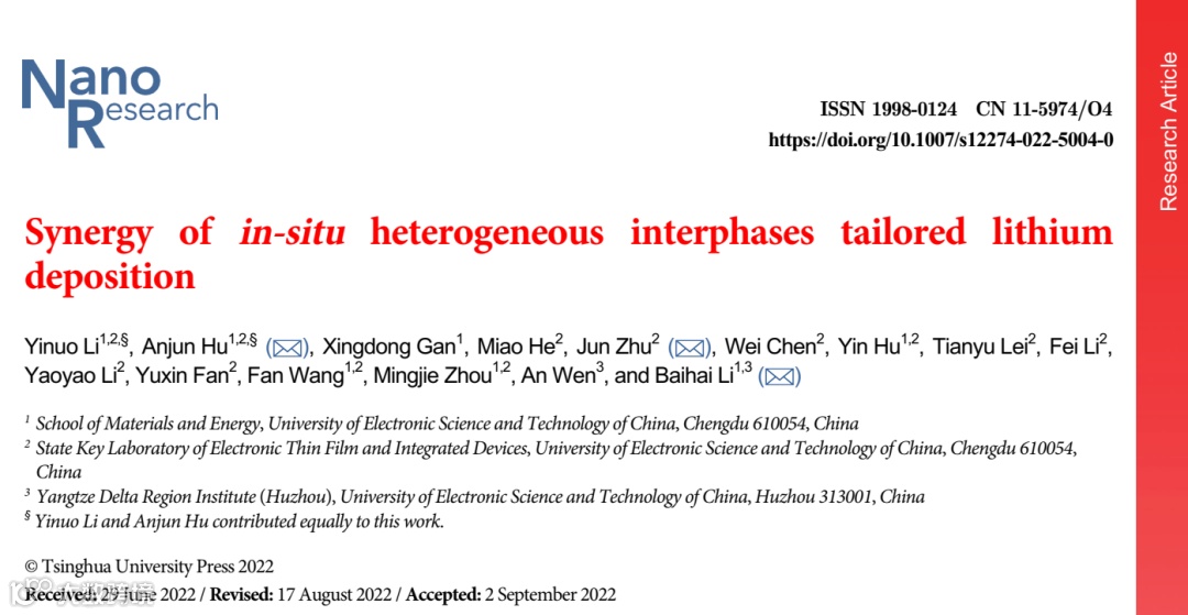 Y. Li, A. Hu, X. Gan, et al. Synergy of in-situ heterogeneous interphases tailored lithium deposition. Nano Res. (2022).