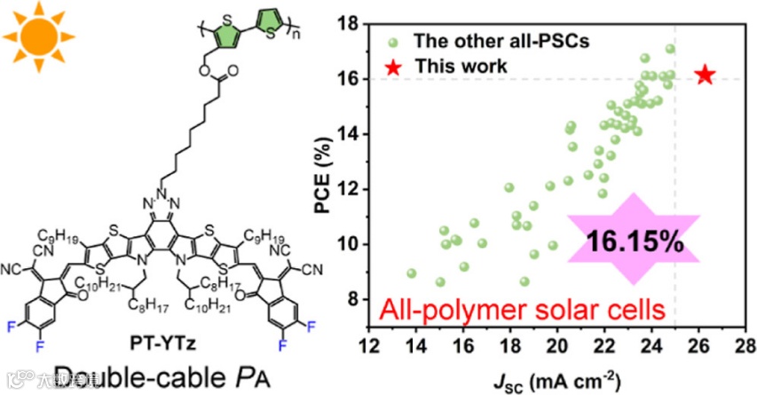 实验结果表明:PT-YTz很好地保留了小分子受体的优点,具有良好的溶解性和成膜性,薄膜吸收边进一步红移(1.31 eV)且有着较高的薄膜吸光系数1.39×105 cm-1。在最优器件条件下,基于PM6:PT-YTz的二元全聚合物太阳电池获得了16.15%的光电转换效率(图1),其短路电流高达26.27 mA cm-2。