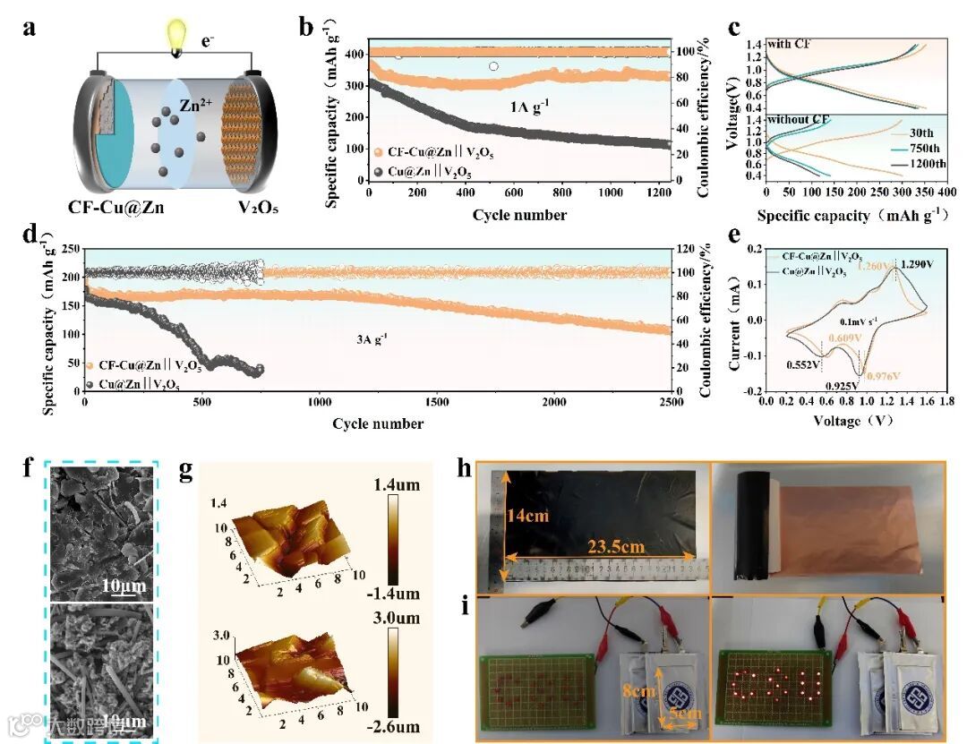 与V2O5正极匹配为全电池后展现出了较高的充放电比容量,在1A g-1下稳定循环1200圈后仍有89%的容量保持率;即使在3A g−1的高电流密度下,也能稳定循环2500圈。全电池循环后的CF-Cu@Zn负极仍如所预期一样保持“平躺”的片状锌沉积形貌。