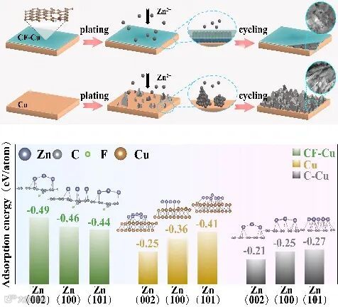 图1. 锌在CF-Cu和Cu上的沉积示意图,以及不同基底对锌各晶面的吸附情况。