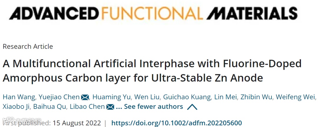 Han Wang, Yuejiao Chen*, Huaming Yu, Wen Liu, Guichao Kuang, Lin Mei, Zhibin Wu, Weifeng Wei, Xiaobo Ji, Baihua Qu, Libao Chen*, A Multifunctional Artificial Interphase with Fluorine-Doped Amorphous Carbon layer for Ultra-stable Zn Anode, Adv Funct Mater.