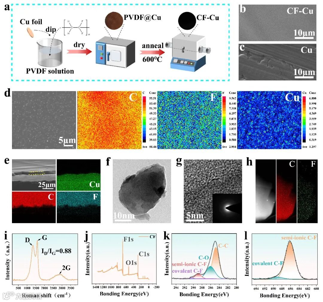 通过简单的浸渍成膜和退火工艺既能在铜基集流体表面构建一层厚约6um的氟掺杂无定形碳基保护层,从其相关的SEM, TEM及相关的mapping图上能看出氟元素的均匀分布及碳的无定形形态,F元素的掺入增加了碳层中缺陷的数目,增强了其导离子的能力,相关的XPS也阐明了F的存在形态。
