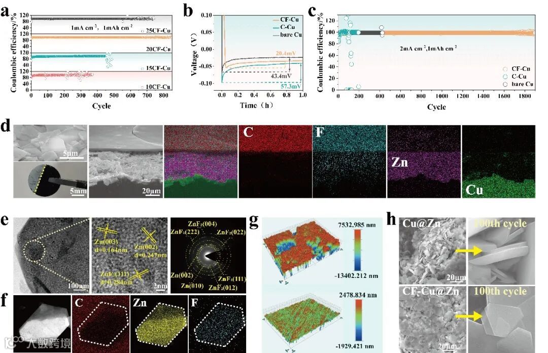 调参后的CF-Cu电极展现出了较低的形核过电位,较高的库伦效率及循环稳定性。图2d中的SEM和相关的mapping能清楚地看出金属锌沉积到CF保护层之下。将循环后的电池拆解,取下CF保护层进行TEM,电子衍射和mapping表征能发现ZnF2的存在(图2e和f),同时将揭了保护层的基底进行光学轮廓和SEM表征,即得CF-Cu上均匀分布且平行于基底表面的锌片状沉积形貌。此结果表面CF保护层的引入很大程度地抑制了枝晶的生长,增强了电极的循环稳定性。