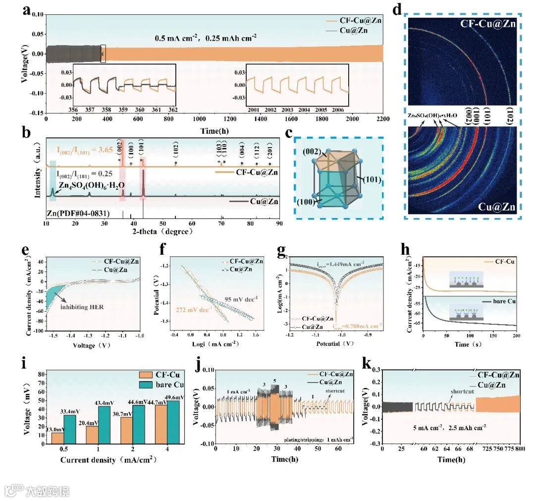 图3. CF-Cu集流体相关电化学性能及锌沉积形貌的表征.