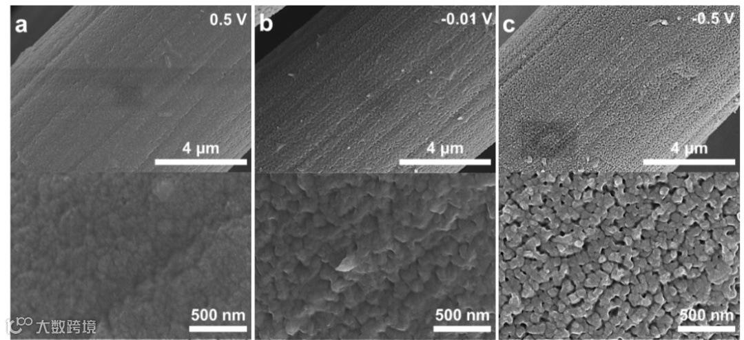 图6. PA@POFA@C在(a) 0.5 V, (b) -0.01 V和(c) -0.5 V时的SEM图。