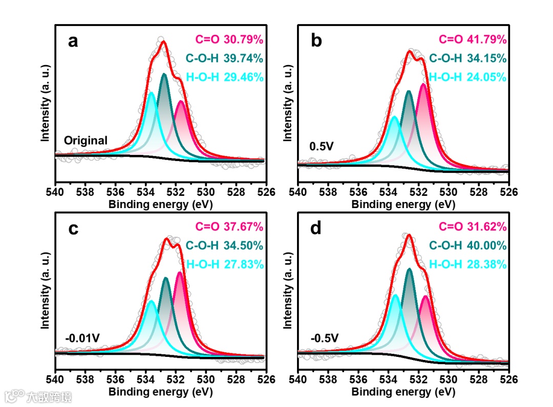 图5. PA@POFA@C在(a)初始态、(b) 0.5V、(c) -0.01V和(d) -0.5V时的O 1s谱。
