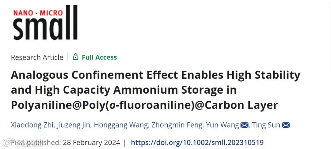 近日,东北大学的孙挺教授课题组,在国际知名期刊Small上发表题为“Analogous Confinement Effect Enables High Stability and High Capacity Ammonium Storage in Polyaniline@Poly(o-fluoroaniline)@Carbon Layer”的研究文章。该文章分析了聚苯胺在发生氧化还原反应时分子结构的变化,发现聚苯胺材料在充放电循环过程中不稳定的原因。为解决聚苯胺材料不稳定的问题,作者受限域效应启发,制备出一种聚苯胺@聚邻氟苯胺@碳层(PA@POFA@C)的复合材料,实现了高稳定性和高容量的铵离子储存。