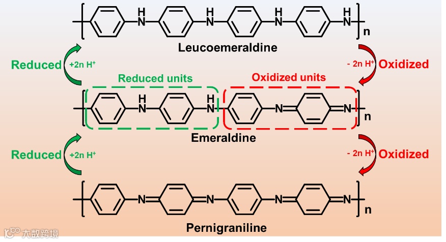 图1. 聚苯胺在氧化还原过程中的结构变化示意图。