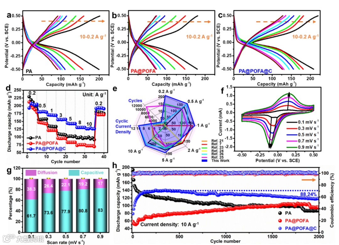图3h显示了PA、PA@POFA和PA@POFA@C在10 A g-1下的恒电流循环稳定性。PA@POFA@C获得了比其他两种电极更高的容量,并且其循环稳定性显著提高,在10 A g-1下循环2000次后,其容量保持率为88.24%。