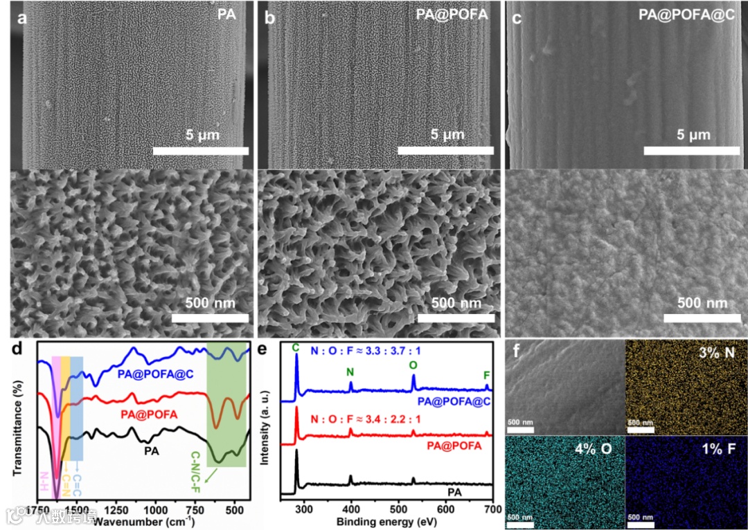 图2. (a-c) PA,PA@POFA和PA@POFA@C的SEM图。(d) 和 (e) PA, PA@POFA和PA@POFA@C的FTIR和XPS全光谱。(f) PA@POFA@C能谱图。