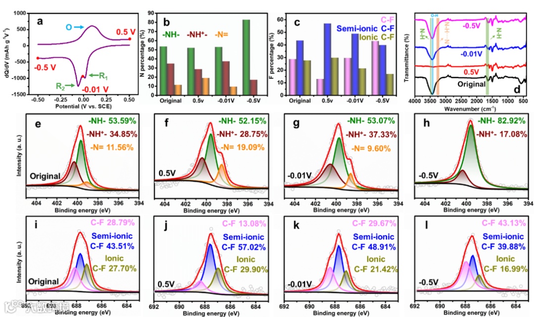 图4. (a) 0.2 A g-1电流密度下PA@POFA@C的dQ/dV曲线。(b) 和(c)在特定电压条件下XPS N1s(图e-h)和F1s光谱(图i-l)的N和F百分比含量。(d) PA@POFA@C在不同充放电状态下的原位FT-IR光谱。