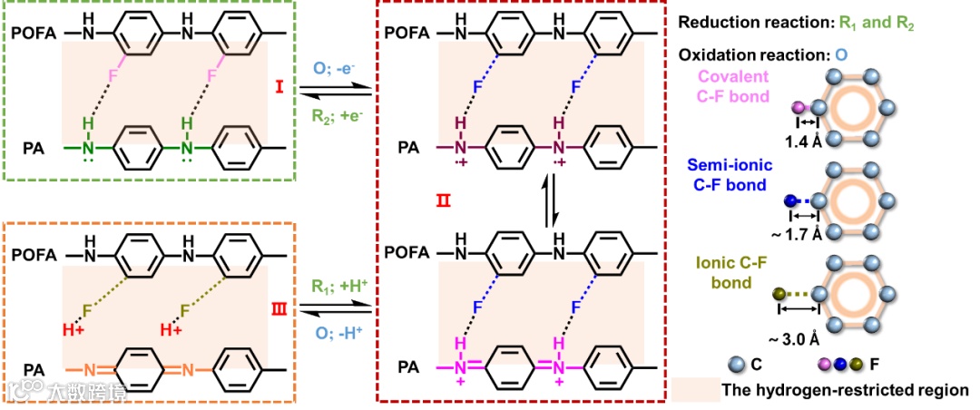 如图7所示,在氧化还原反应的不同阶段(Ⅰ,Ⅱ,Ⅲ),弹性的C-F键始终限制着H的移动,在PA层和POFA层之间形成一个限制H的区域,使得聚苯胺材料在氧化还原的过程中可以完整的相互转化,从而实现稳定的铵离子储存。