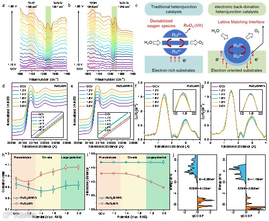Figure 4. Investigating the structure evolution during OER. In-situ FTIR spectra of (a) RuO2/BN and (b) RuO2/BNNS in the range of 1000−1400 cm−1 at different applied potentials. (c) Schematic illustration of charge compensation and chemical oxidation on the different interfaces. Operando XAFS for Ru K-edge of (d) RuO2/BN and (e) RuO2/BNNS. The inset demonstrates a detailed view of the absorbing edge, respectively. Operando EXAFS of (f) RuO2/BN and (g) RuO2/BNNS with applied bias rise from 1.2 to 2.0 V versus RHE. (h) The valence states of RuO2RuO2/BN and RuO2/BNNS fitted by Ru K-edge absorption energy at different potentials. (i) Summary of the Ru–O interatomic distance of RuO2/BN and RuO2/BNNS at various potentials. (j) Crystal orbital Hamilton population (COHP) analysis and the corresponding integrated crystal orbital Hamiltonian population (ICOHP) values of RuO2/BN and RuO2/BNNS.