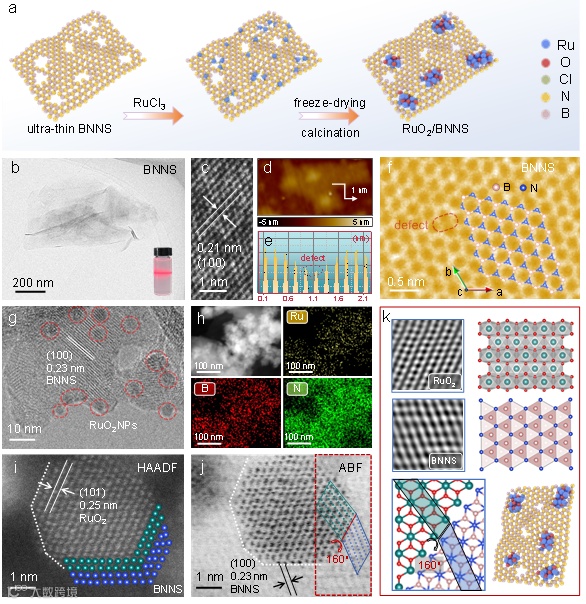 Figure 1. Catalyst design and structured characterization. (a) Schematic illustration of the preparation process of RuO2/BNNS. (b-c) The TEM and high-resolution TEM images of BNNS (inset in b: Photograph of BNNS suspension with Tyndall effect). (d) AFM images and the corresponding height profiles of a flat BNNS. (e) Intensity profiles along the image c. (f) Atomic resolution STEM image of BNNS with vacancies (as indicated by the dotted box) and structure analysis images. (g-h) The TEM image and corresponding element mapping images of synthesized RuO2/BNNS. (i-j) High angle annular dark field (HAADF) and annular bright field (ABF) STEM images of RuO2/BNNS. The colored balls represent the RuO2/BNNS connections at the interface with similar angles. (k) The corresponding inverse fast Fourier transform (IFFT) images and atomic structure of RuO2 (top) and BNNS (middle) in RuO2/BNNS, respectively. The atomic model of RuO2/BNNS with lattice-matched interfaces (bottom).
