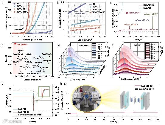 Figure 2. Electrocatalytic acidic OER performance. (a) linear sweep voltammetry (LSV) of BN, RuO2, RuO2/BN, and RuO2/BNNS recorded at a scan rate of 5 mV s−1 in 0.5 M H2SO4 solution with iR correction, and (b) the relevant Tafel slopes. (c) Chronopotentiometric curves of RuO2/BN, and RuO2/BNNS. (d) Comparison of OER activity using the reported electrocatalysts. Bode plots at the potential range of (e) RuO2/BNNS, and (f) RuO2/BN from 1.30 to 1.60 V (vs. RHE). (g) Pulse voltammetry protocol curves. (h) PEM device performance (200 mA cm-2) using commercial Pt/C and RuO2/BNNS as catalysts in the PEM electrolyser. A schematic of PEM electrolyte is shown in the inset, in which the anode and cathode sides are separated by a Nafion membrane.