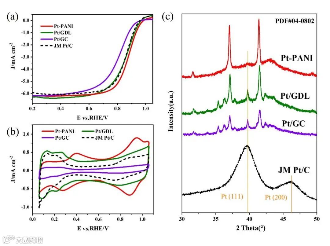 图3. Pt-PANI,Pt/GDL,Pt/GC和JM Pt/C的(a)ORR,(b)CV和(c)XRD的曲线。H2PtCl6溶液的pH为0.2,浓度为50 mM,Pt的负载量为28 µg cm-2。在O2饱和的0.1 M HClO4溶液中,使用RDE以1600 rpm和0.01 V/s的扫描速率进行ORR极化曲线扫描。