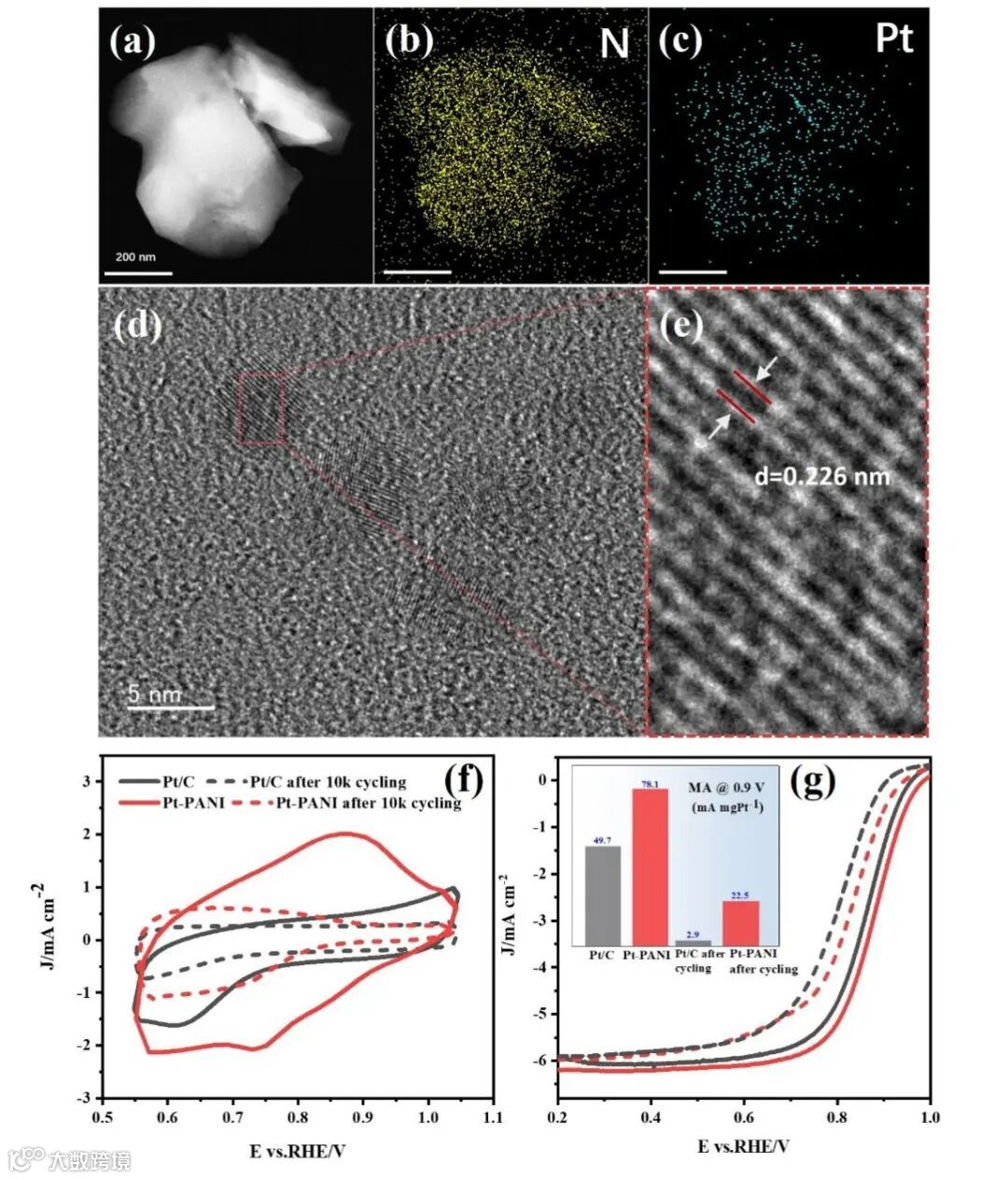 图4. (a) Pt-PANI的透射电子显微镜图像,结合(b-c)能量色散X射线元素分布图,(d) Pt纳米颗粒的高分辨透射电子显微镜图像,(e) (b)中方形区域的逆快速傅里叶变换(IFFT)。(f) Pt/C和Pt-PANI稳定性测试的CV和LSV曲线。(g)中的图表显示了Pt/C和Pt-PANI经过稳定性测试后的比表面活性。
